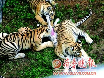 本報(bào)威海7月10日訊(記者 王帥) 三只老虎活生生把另外一只老虎咬死,并啃食其尸體。近日有網(wǎng)友爆料稱,在威海榮成西霞口景區(qū)神雕山野生動(dòng)物園游玩時(shí),見(jiàn)證了這樣一幕。10日,西霞口景區(qū)回應(yīng)稱老虎打架事件確有發(fā)生,原因還在調(diào)查中。 9日晚上,網(wǎng)友“庶民”發(fā)帖稱,9日早上7點(diǎn)多,在逛西霞口神雕山野生動(dòng)物園時(shí),看到了血淋淋的一幕:三只老虎摁著一只口鼻出血、顯然已經(jīng)死亡的幼虎撕咬。從這名網(wǎng)友發(fā)布的照片看,被撕咬老虎四肢朝天躺在地上,一只老虎死死咬住它的咽喉,另外兩只老虎撕咬其大腿,場(chǎng)面相當(dāng)血腥。 10日,神雕山野生動(dòng)物園經(jīng)理田潤(rùn)杰向本報(bào)記者證實(shí),老虎打架事件發(fā)生在“和諧樂(lè)園”,工作人員發(fā)現(xiàn)打架事件后,用了十分鐘左右的時(shí)間將三只襲擊同伴的老虎驅(qū)趕開(kāi),并緊急將受傷白虎送治,但經(jīng)過(guò)搶救無(wú)效后死亡。 田潤(rùn)杰介紹,死亡的老虎是一只白虎,才十個(gè)月大;其他三只是孟加拉虎,也都剛滿一歲。每天下午6點(diǎn),工作人員為老虎喂食,食物以牛肉、雞蛋、維生素為主,一歲左右的老虎一頓進(jìn)食約四斤牛肉。他認(rèn)為,老虎食物的供應(yīng)量每天都有嚴(yán)格的規(guī)定,基本能夠滿足它們的需求,網(wǎng)友說(shuō)的因饑餓打架的可能性是不成立的。 田潤(rùn)杰表示,西霞口景區(qū)非常重視此次事件,正在組織有關(guān)專家分析原因,一有結(jié)果便會(huì)向社會(huì)公布。 (請(qǐng)照片作者與本報(bào)聯(lián)系領(lǐng)取稿酬)