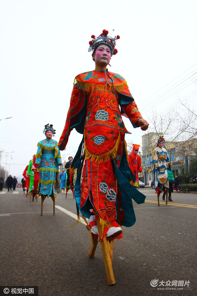 2017年02月03日,山東省棗莊市山亭區(qū)農(nóng)民自發(fā)舉行“民俗展演鬧新春”活動,身著盛裝開展竹馬、舞龍、舞獅等民俗文化展演活動,為春節(jié)后上班的人們送祝福,載歌載舞鬧新春。