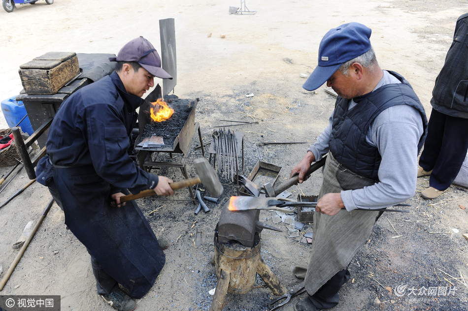 據了解,郭師傅,今年63歲,山東日照兩城鎮(zhèn)9村村民,從25歲開始跟著老一輩從事這行當,兒子從22歲跟隨他從事這行業(yè),隨著制造業(yè)的快速發(fā)展,如今靠手工打造、修補器具的越來越少,這行當臟、累,掙錢不多,從事鐵匠這行業(yè)的也越來越少,以后這行當或許就消失了,只有周邊村鎮(zhèn)逢集就來擺攤打鐵,給村民修復農具,一天收入百十元到300元左右不等,雖然又臟又累掙不了多少錢,每當看到村民滿意的從手中接過農具,心里也非常高興。圖片作者:郭磊/視覺中國