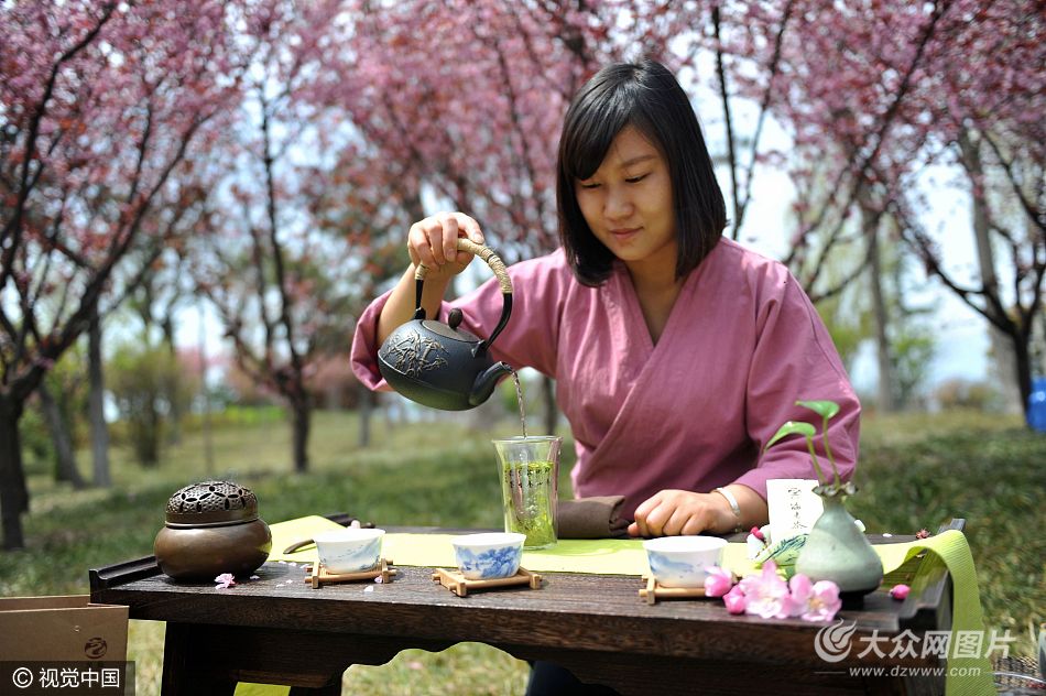 2017年4月16日,山東青島唐島灣海濱公園,在盛開的海棠花下,國學愛好者們舉辦了《春日雅集》活動。在天籟般古琴的伴奏中,瑜伽、禪舞、漢服舞蹈在花下起舞,陶笛、蕭聲古韻優雅,書畫、書法創作吸引眾多游客,茶藝伴隨花香飄向大海深處。