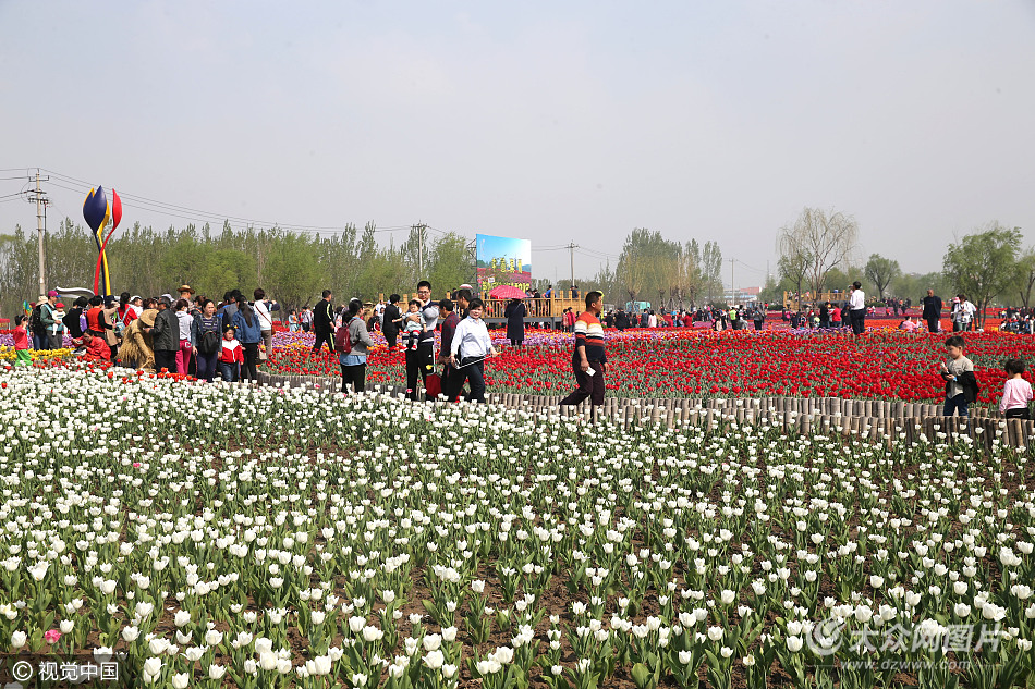2017年4月15日,山東濱州,游客在秦皇河公園荷蘭風(fēng)情村觀賞盛開的郁金香。當(dāng)日,為期半個月的山東濱州第四屆國際郁金香文化節(jié)開幕,位于山東省濱州經(jīng)濟技術(shù)開發(fā)區(qū)的秦皇河公園荷蘭風(fēng)情村的金色牛津、純金、水晶屋、白日夢、紫旗、橙色達爾文等30多個品種300多萬株各色郁金香競相綻放,吸引眾多游客前來觀賞。