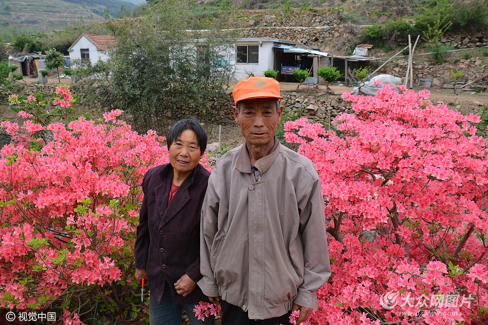 2017年4月25日,山東日照。今年63歲的李吉祥和67歲的許傳美,是山東省日照市九仙山風景區內,位于大山深處的宣王溝村人。從1998年開始,夫妻兩人在離村子東南2里多的自家口糧地,以及山澗地頭上,栽種培育了近百畝杜鵑花和金銀花,花開時節,杜鵑花和金銀花競相綻放,花香四溢,蜂蝶飛舞,使昔日的荒山變成現在的“私家花園”,成為九仙山景區內一道亮麗的景觀。
