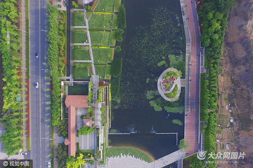 2017年5月7日,俯瞰經(jīng)過數(shù)年治理后的青島市李村河變生態(tài)景觀長廊,成為市民休閑娛樂的濱河水岸后花園。 圖片作者:王海濱