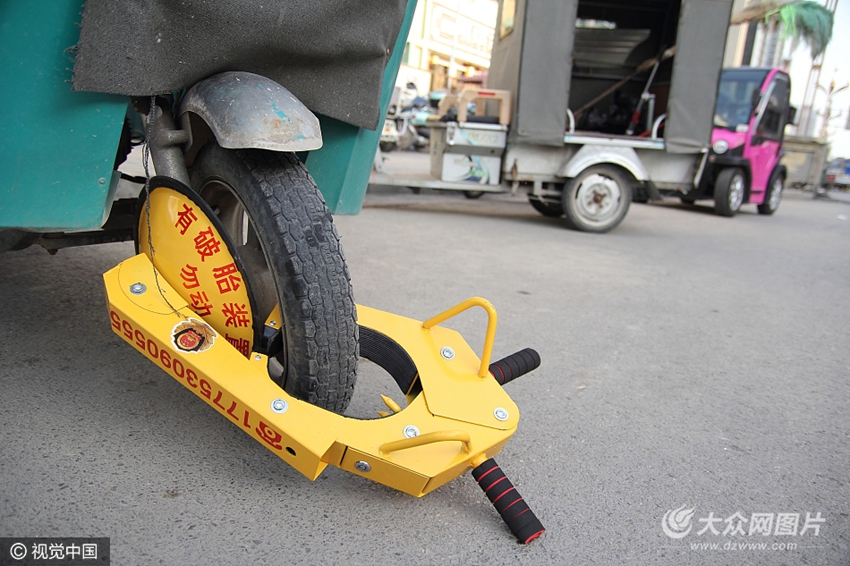 2017年5月9日,山東菏澤,當(dāng)?shù)亟痪块T對(duì)三輪、四輪電動(dòng)轎車亂停亂放問題開展整治行動(dòng),市區(qū)道路上亂停放的找不到車主的,阻塞交通的三輪、四輪電轎車就地上鎖,此鎖自帶爆胎裝置,如車主帶鎖強(qiáng)制起步,該鎖具便會(huì)自動(dòng)爆胎。鎖具上均有聯(lián)系方式,亂停亂放車輛被上鎖后,車主可撥打鎖具上的聯(lián)系方式,然后選擇就近的交警崗?fù)みM(jìn)行處理。按照法律規(guī)定,交警部門將對(duì)此類車主罰款10元,并對(duì)車主進(jìn)行教育。