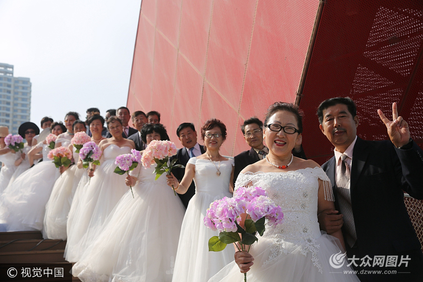 5月20日,在青島海岸青年廣場(chǎng)上演了一場(chǎng)子女專為父母補(bǔ)辦的集體海邊婚禮,忙碌半生的老人們身著潔白的婚紗,與愛人一起攜手“重返20歲”。