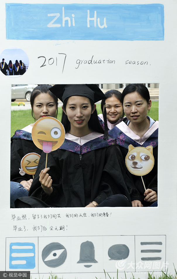 2017年5月23日,山東聊城大學美術學院2013級設計學專業的大學生拍攝創意畢業照致青春。當日,8名設計學專業的大學生自己設計社交網站App對話面板、表情包、圖標等,將專業優勢與畢業季結合起來,留下屬于自己獨特的記憶。