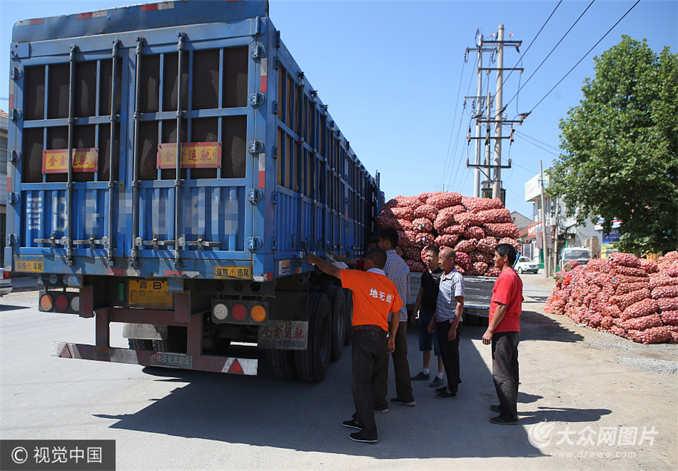 2017年5月25日,山東省濟南市,大蒜產地濟陽縣曲堤鎮進入鮮蒜采收高峰期,外地來收蒜的車輛明顯增多,鮮蒜收購價較幾天前略有上漲。圖片作者:高立萌/視覺中國