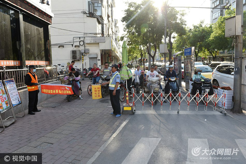 5月26日,在濟南山大北路二環(huán)東路路口,4個方向的非機動車道路口停車線上均多了一個伸縮護欄、一條攔阻繩,攔阻繩上寫著“不要闖紅燈 不要越線停車”,不少非機動車被攔在護欄后,等待綠燈時放行通過。按照事前約定好的分工,路口的協(xié)勤和文明交通志愿者一位操作護欄,一位操作攔阻繩,每當黃燈時便開始準備,紅燈時拉開,阻止行人、非機動車闖紅燈、越線停車。攔阻繩和伸縮護欄設(shè)置后,市民遵章守法的概率大大提高,經(jīng)過勸阻提示,市 民了解了自己應該如何遵守交通秩序,路口的交通情況得到了改善。