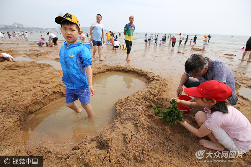 5月29日,游人在青島第一海水浴場休閑度假。端午小長假期間,海濱城市青島旅游爆棚,各大海水浴場再現(xiàn)酷暑時(shí)節(jié)人山人海下餃子的盛況,游人洗海澡戲水玩沙趕海撈海鮮各得其樂,盡情享受歡樂假日。