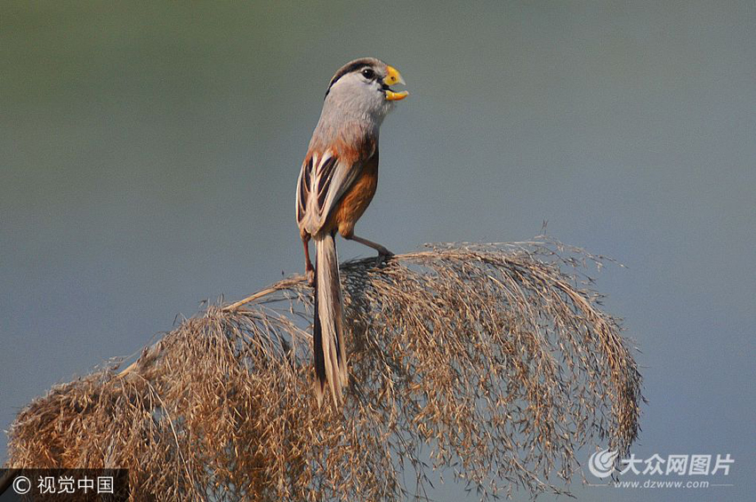 6月1日,數量在10只以上、全球瀕危的“鳥中熊貓”震旦鴉雀在青島市白沙河入海口濕地陸續被發現。圖為生活在蘆葦叢中的震旦鴉雀。