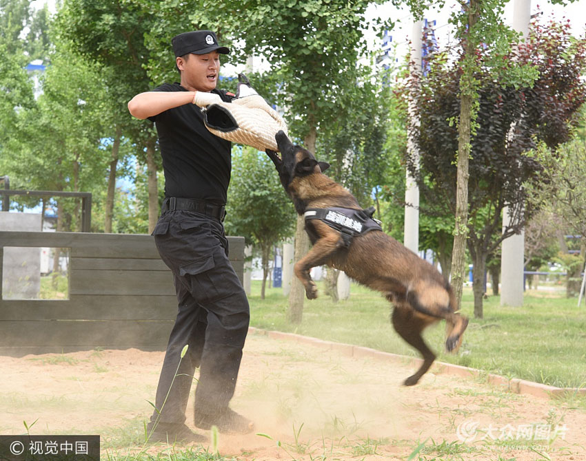 6月12日,臨沂市沂南縣公安局警犬訓練場,民警徐軍對警犬訓練“咬靶”項目。