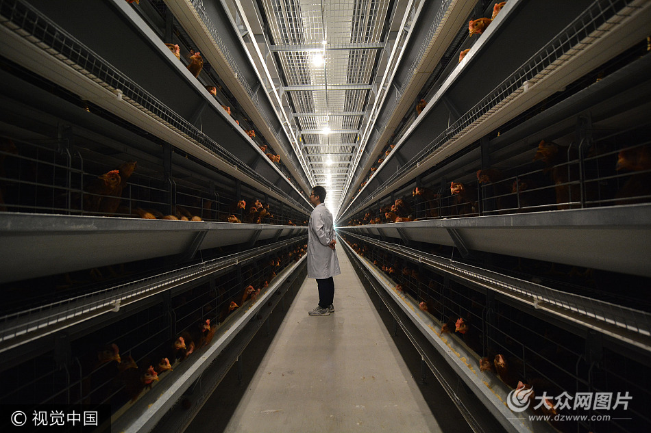 2017年6月20日,在山東省日照市河山風(fēng)景區(qū)南麓的大桃園村德泰畜牧養(yǎng)殖基地,侯健正在雞舍內(nèi)查看蛋雞生產(chǎn)情況。