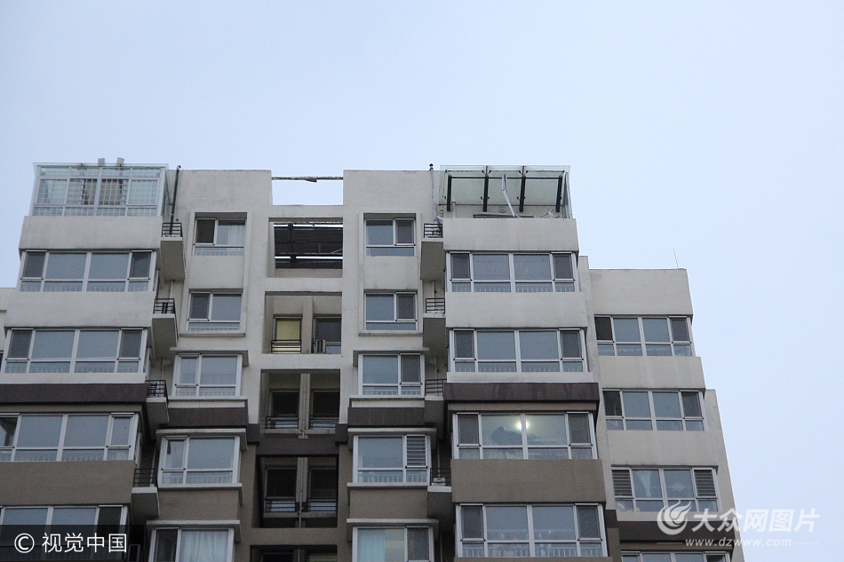 2017年6月21日,山東菏澤,傍晚時(shí)分,當(dāng)?shù)赜瓉肀┯瓯⑻鞖猓瑩?jù)氣象部門預(yù)報(bào),風(fēng)力高達(dá)陣風(fēng)7-8級(jí)。一小區(qū)18樓住戶的陽臺(tái)玻璃及合金框架整個(gè)被大風(fēng)刮落,散落在小區(qū)道路上。