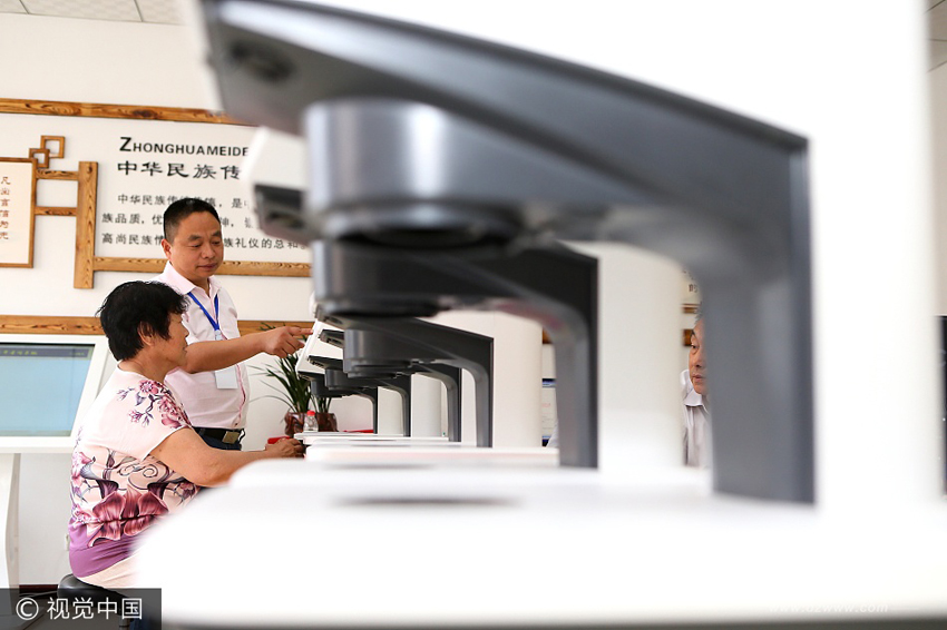 6月22日,即墨市藍村鎮王演莊社區的工作人員王文祥(右)指導村民使用“智能蓋章機”。