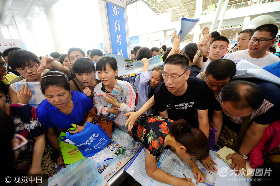 2017年6月25日,濟南,2017年山東高招會在舜耕國際會展中心舉行,從凌晨四點開始就有家長和考生前來排隊,早上7點時,等候入場的考生和家長達到兩千余人,入口處排起200多米長的隊伍。 在高招會現場,眾多家長擁堵在高校不足2米長的展臺前,為孩子咨詢志愿填報。