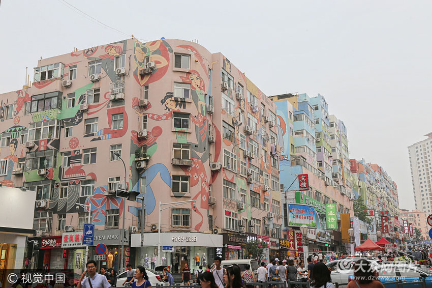 7月5日,青島,臺東商業步行街,道路兩旁的十余棟居民樓的墻體畫滿大型墻繪,這些手繪圖案高達七層樓,除了窗戶玻璃,居民樓墻體其余部分全部被圖案覆蓋。