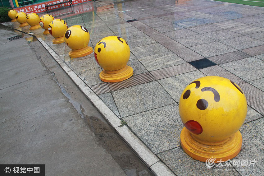 7月6日,在濟(jì)南少年路附近,近百石墩涂抹成QQ版表情包排隊(duì),十分吸引眼球。原本不起眼的石墩,搖身一變成了真實(shí)版QQ表情,給泉城市民帶來一絲喜悅。