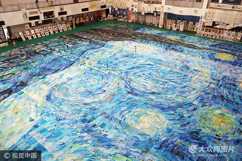 本次美術(shù)展最大的亮點來自于近萬名少年兒童花費兩周時間共同創(chuàng)作的巨幅拼畫。該拼畫以梵高著名的畫作《星空》為藍本,將整幅畫化整為零,分配給每位學(xué)生單獨畫出,最后在體育館里拼接在一起組成完整的拼畫。