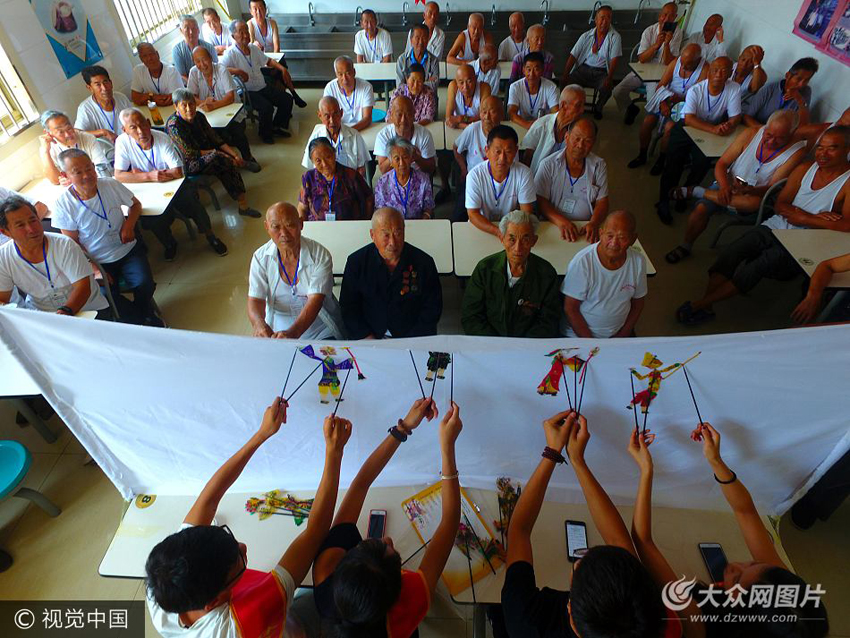 7月12日,在聊城市復退軍人醫院,志愿者在給老人們表演皮影戲。