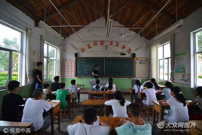 7月18日,在日照市五蓮縣叩官鎮北回頭小學,11名中國留美學生在教室里,冒著35度的炎熱天氣,在教授小學生美術、英語、音樂、繪畫等課程,使20余名“留守兒童”免費上“特長班”。當日,青島理工大學的幾名志愿者也參加了特長培訓活動。