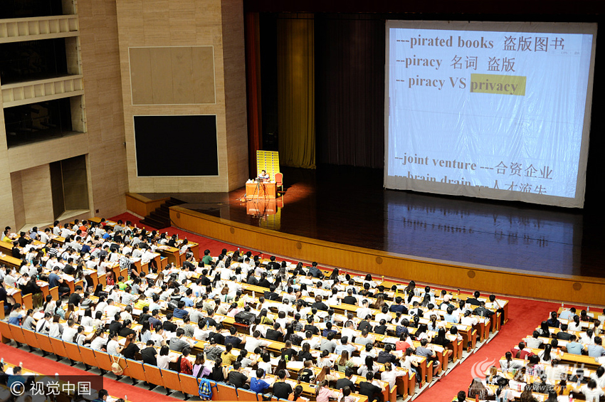 7月20日,濟(jì)南,在馬鞍山路的山東會(huì)堂內(nèi),3層樓的觀眾席坐滿2000多名在校大學(xué)生同上一堂暑期考研培訓(xùn)課。