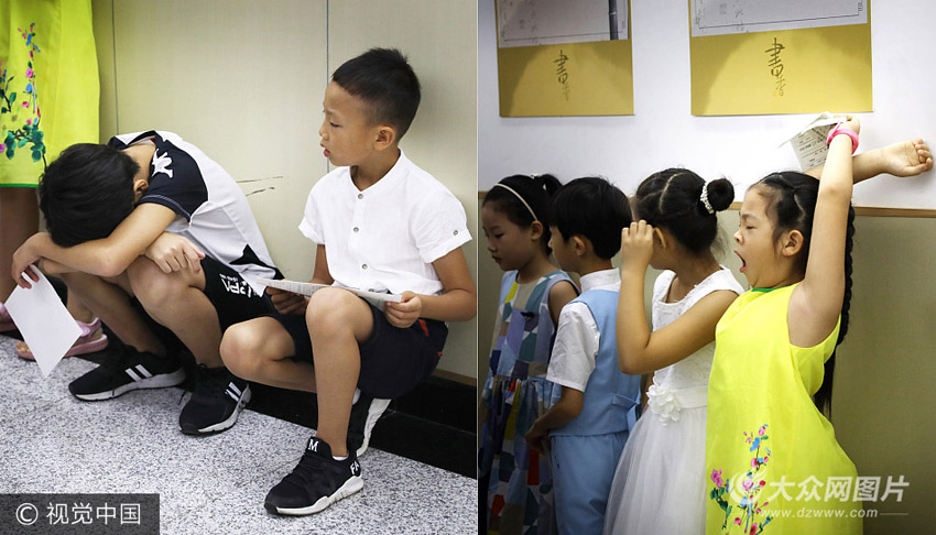 8月9日,威海。考場外,有的孩子蹲在角落里休息,有的孩子打起了哈欠。