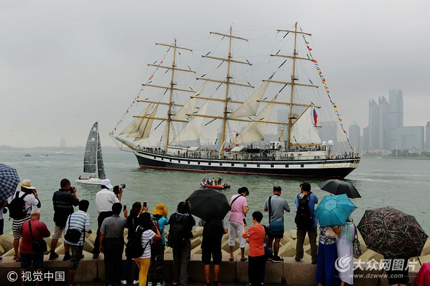 2017年8月14日,青島,俄羅斯大帆船“帕拉達”號駛離青島 市民依依不舍,在奧帆中心情人壩上冒雨相送。