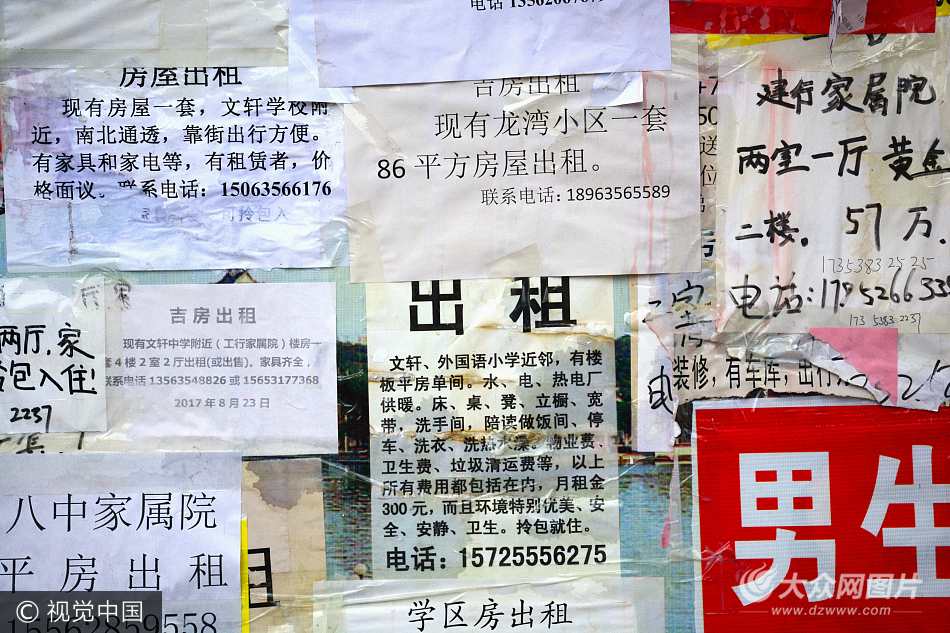 2017年8月28日,山東聊城,隨著開學季的來臨,陪讀房廣告信息再次“攻占”廣告欄。租賃市場迎再次被“點燃”,不少陪讀家長為了讓孩子能有個更好的學習環境,不惜花重金租房陪讀,據了解,多數名校附件陪讀房屋價格不菲,兩居室的房屋三年下來也要十多萬,盡管如此名校附近的陪讀房仍然處于“一房難求”的狀態。