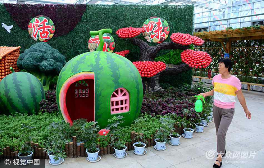 8月29日,聊城一農業展覽館內現百萬果蔬拼成的“最美童話世界”,據了解,該展覽館內共有包括十米西紅柿高塔在內的各種童話造型80余個,由數百萬個瓜果蔬菜拼湊而成,十分有趣吸引了不少游客觀光游玩。
