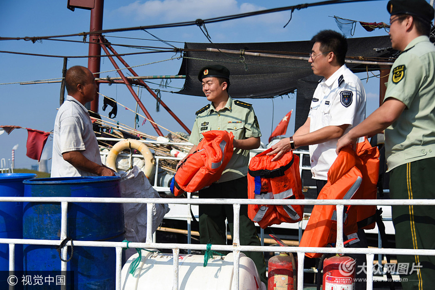隨著開漁日期臨近,漁民們開始整網補給、辦理出海手續, 出海生產積極性高漲。在東營市廣利漁港,由當地漁政、邊防組成的涉海部門服務隊登上船舶開展安全檢查和法制宣講,邊防民警幫助漁民整理網具,共同喜迎“金秋第一網”。