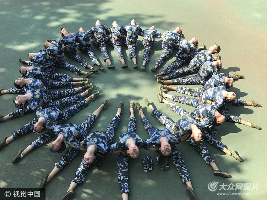 9月7日,濟南,在山東師范大學千佛山校區的新生軍訓場地,千余名2017級新生們開始軍訓。音樂學院舞蹈專業的十幾名女生利用休息時間,相互比拼舞蹈技能,向師生展示一字馬、大跳等優美舞姿,為軍訓生活增添一份活力。據了解,今年音樂學院大學新生中年齡最小只有16歲,雖然都是藝術生,但在軍訓過程所有學生均不允許化妝、戴美瞳、戴首飾,女生必須素顏參加軍訓。