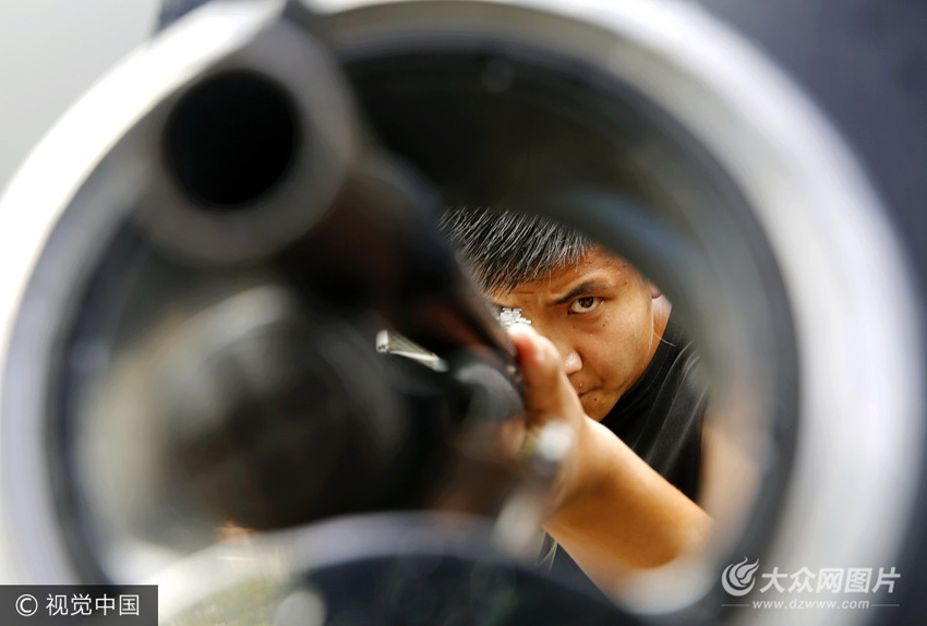 沂南縣公安局特巡警大隊特警隊員在進行車內射擊孔瞄準訓練。