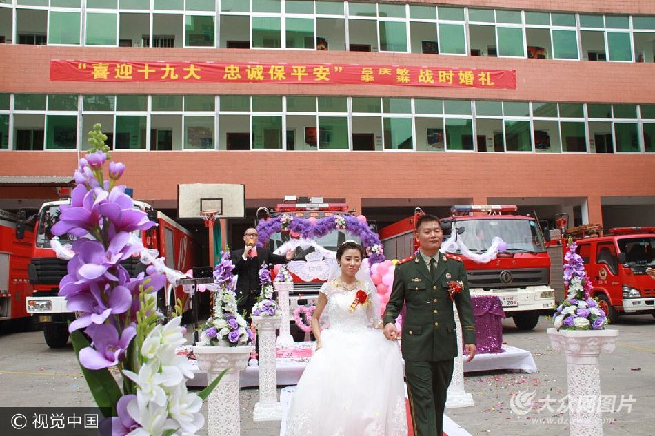 9月17日11點30分,一場浪漫而又莊嚴(yán)的婚禮在陜西省安康市漢濱區(qū)公安消防大隊的警營里舉辦。與普通婚禮不同的是,前來觀禮的不是親朋好友,而是身著警服的消防官兵,四周紅彤彤的消防車見證著一對新人的海誓山盟。