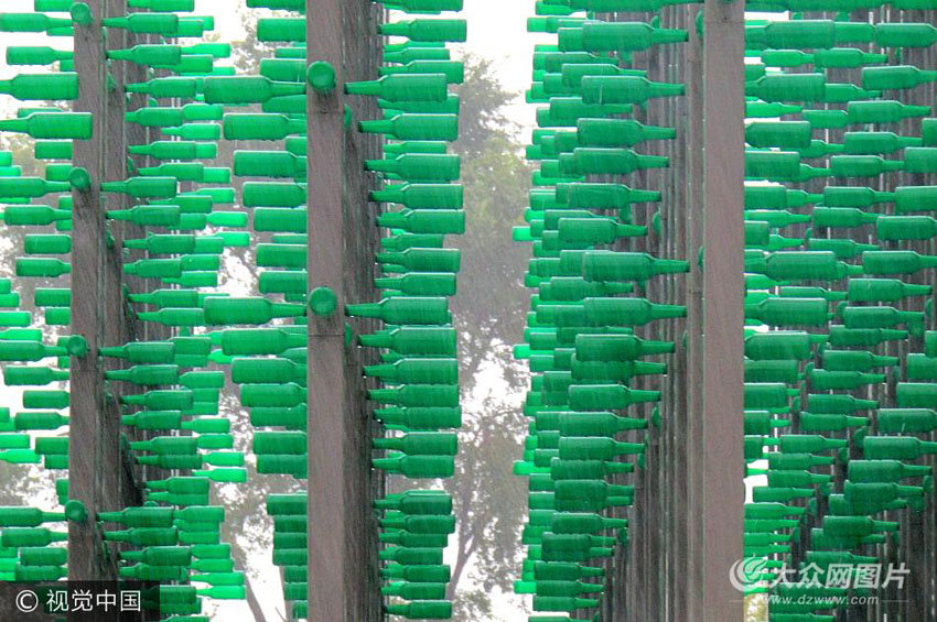 9月26日,青島唐島灣畔,綿綿秋雨中的“啤酒叢林”。當日,青島迎來降雨天氣,唐島灣畔的“啤酒叢林”中,三萬余個啤酒瓶在雨水的持續沖刷下變得光潔如新。