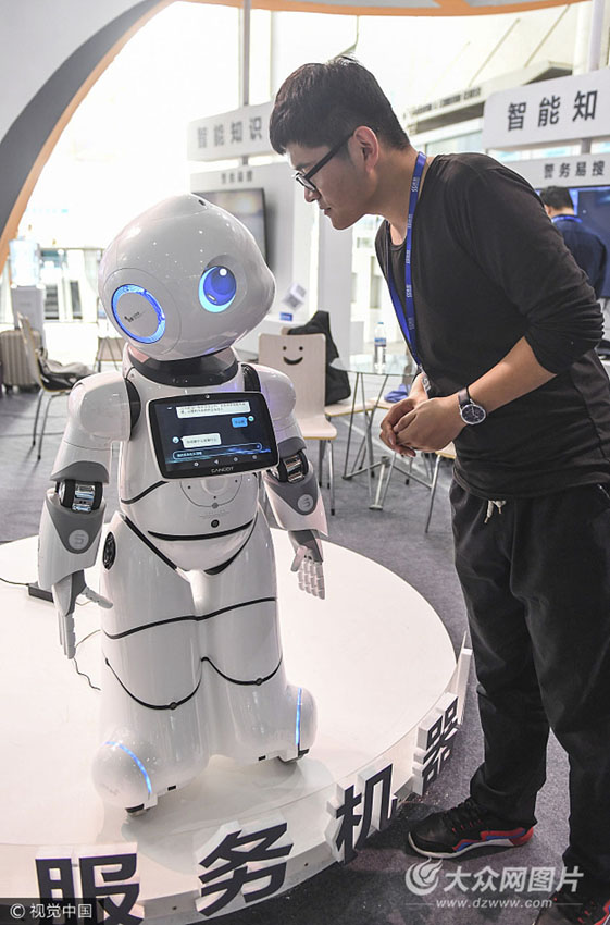 “人臉識(shí)別”機(jī)器人與參觀者互動(dòng)。