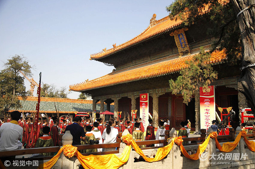 9月28日,丁酉年祭孔大典在山東曲阜舉行,7000余名海內外人士共聚于此,紀念孔子誕辰2568年。圖為大成殿廣場的祭祀儀式。