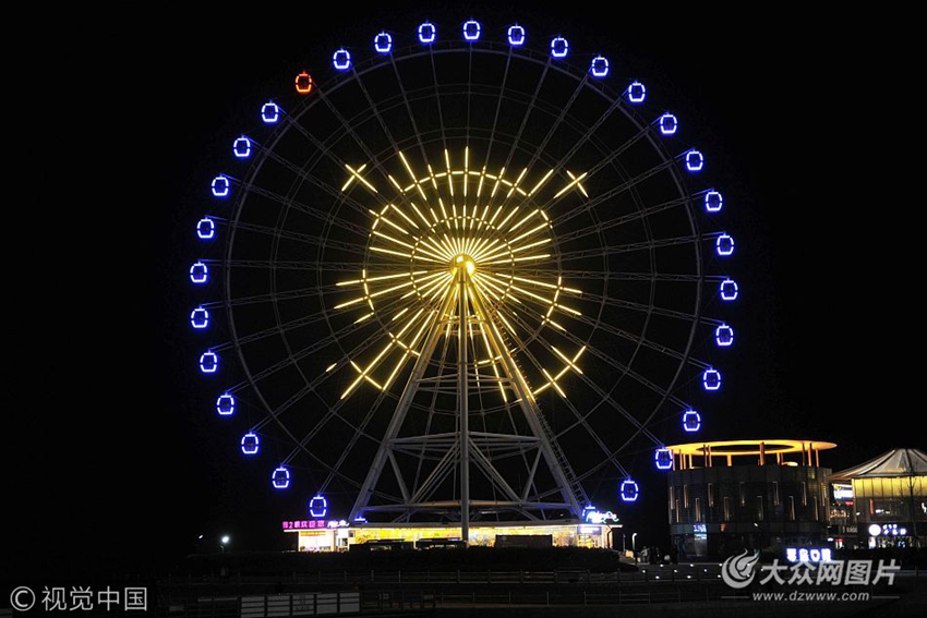 2017年10月31日,山東青島西海岸新區(qū)海上嘉年華,摩天輪亮出“騎行點(diǎn)亮城市”字樣。