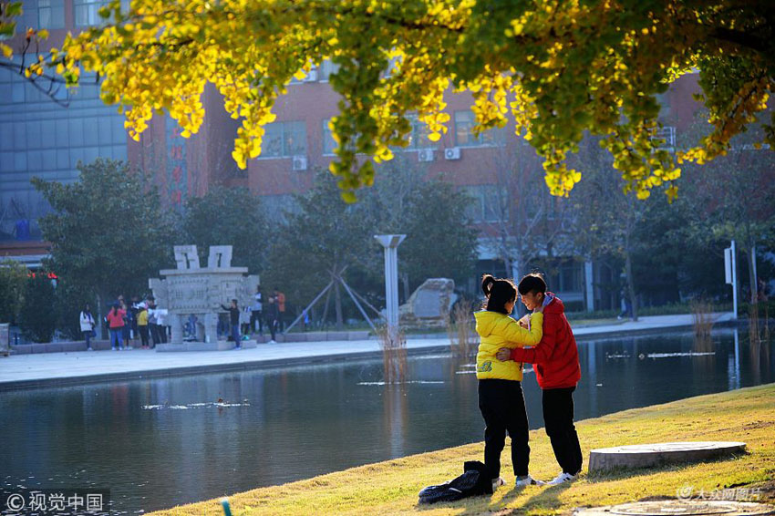 11月5日,位于青島西海岸新區的山東科技大學校園內,銀杏金黃,垂柳依依,大學生們行走在金黃的銀杏樹下和垂柳旁,或者坐在墨水河畔讀書學習、拍照、游玩,金秋如畫的高校校園吸引了不少游客和攝影愛好者前來游玩和拍攝。