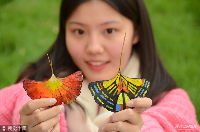 11月7日,山東聊城大學美術學院環境設計專業的大學生魏天欣,她從小喜歡繪畫和觀察身邊事物,近日,她從凋零的銀杏葉上發現靈感,通過網絡查找蝴蝶照片,歸納蝴蝶的顏色和圖案,然后用丙烯顏料在銀杏葉上繪成五彩斑斕的蝴蝶,她還結合自己的繪畫基礎創作了一些繪畫作品。通過繪制蝴蝶,魏天欣了解到,有些珍稀的蝴蝶品種已經瀕臨滅亡,她想通過手繪銀杏葉的方式,讓更多人了解絢爛多彩的昆蟲世界,進而保護身邊的動物。