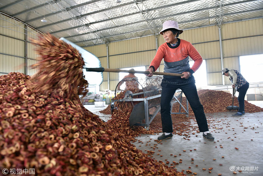 11月8日,在日照市莒縣寨里河鎮(zhèn)龍尾村的烘烤工場(chǎng)內(nèi),留守婦女們正在這里加工山楂干。近百名留守婦女在家門(mén)口的烘烤工場(chǎng)內(nèi)“淘金”,她們每天加工山楂3萬(wàn)斤,干活利索的婦女一天能掙100多元,成為脫貧致富路上的一把好手。
