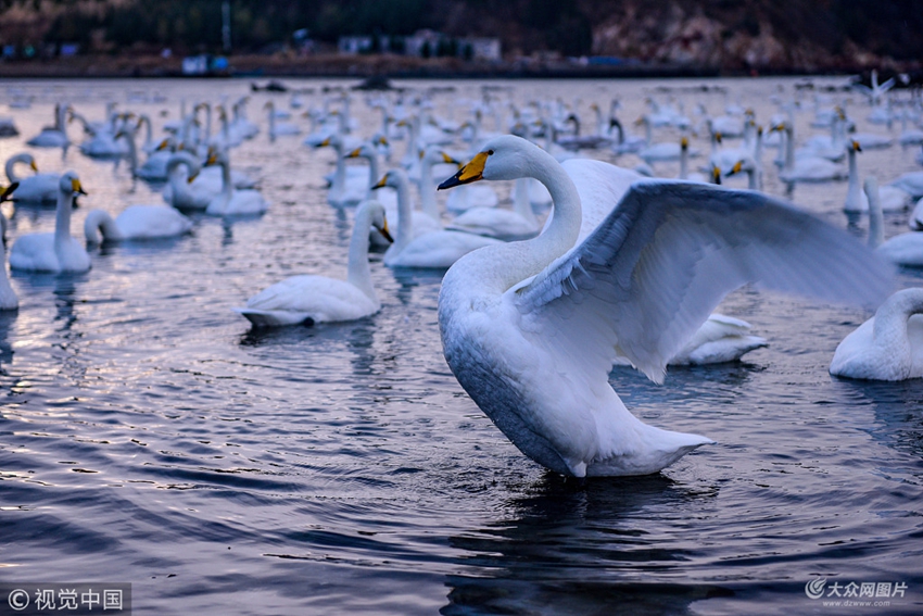 2017年11月24日,山東榮成煙墩角村海邊,幾百只大天鵝從西伯利亞飛到這了棲息越冬。煙墩角是中國馳名的“天鵝村。每年11月至來年3月份都有數百只大天鵝從西伯利亞和蒙古國飛到這里棲息越冬。