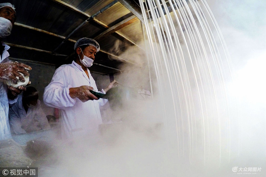 017年11月28日,山東青島西海岸新區李家洼子村,李省一邊給剛加工出的熟粉條進行冷水處理,一邊還要給熱水鍋里加水。