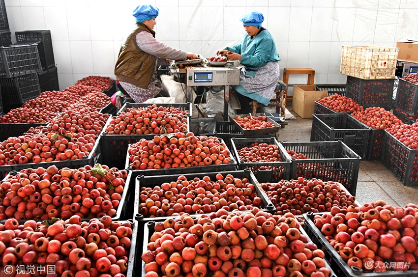 2017年11月29日,在山東省沂源縣悅莊鎮(zhèn)崔家莊村一果品加工企業(yè),當(dāng)?shù)貎擅戮蜆I(yè)的村民在進(jìn)行加工果品。