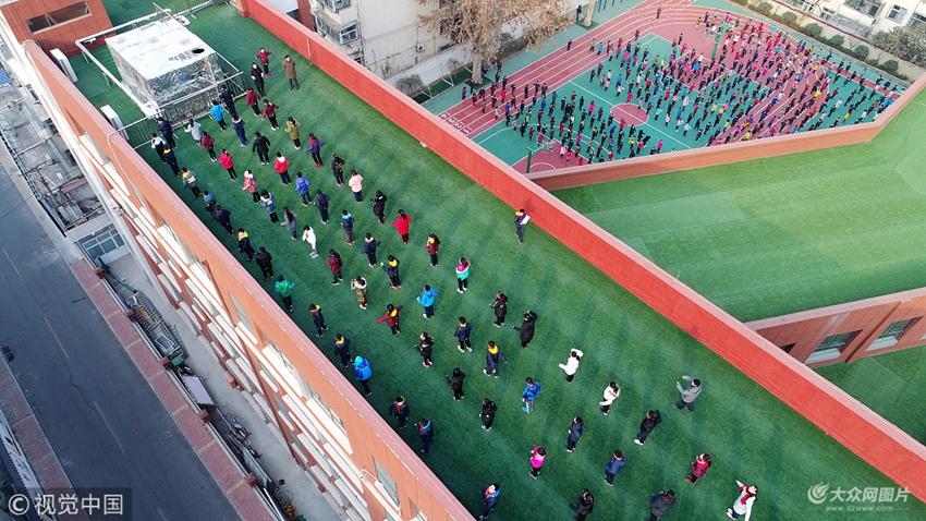 2017年12月13日,山東省濟南市,在歷山東路北首的濟南解放路第二小學,上午10點課間操期間,六年級3個班的學生來到教學樓五樓平臺,在大約300平方米的樓頂操場做課間操,其他一至五年級的學生則在校園的操場和過道內做操。