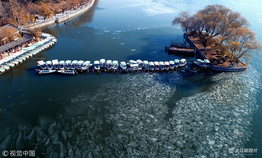 12月18日,濟(jì)南市,連日來泉城持續(xù)低溫天氣,大明湖靠近東北岸的水域大面積結(jié)冰,冰層厚度在2-3厘米之間,面積達(dá)到上萬平方米。船只行駛過后,原來整塊的冰層碎成無數(shù)的小冰塊,在低溫之下又快速的凍結(jié)在一起,從百米高空俯瞰如同一幅巨型冰畫。