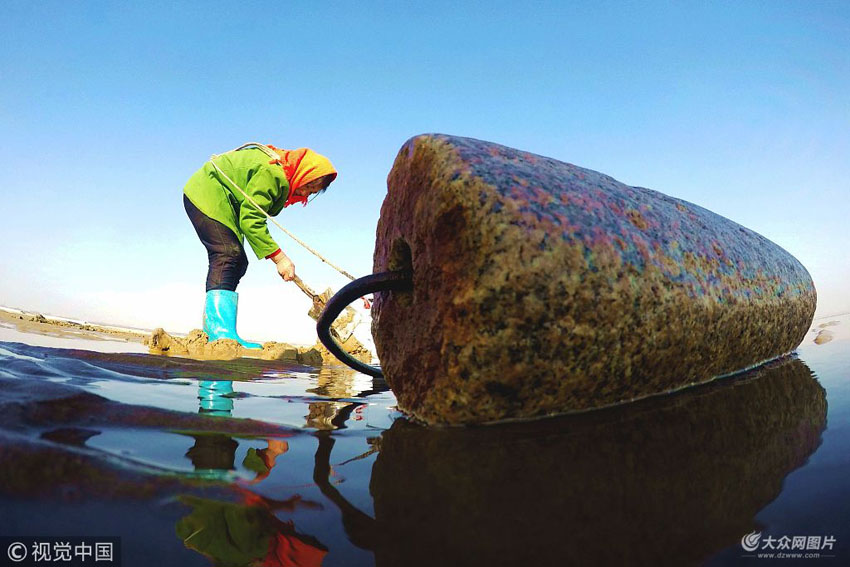12月18日,農歷11月初一,天文大潮,攝影師隨泊里鎮石崖村54歲的村民杜增香來到退潮后的沙灘,當腳底的海灘開始出現積水時,杜增香便開始拖動攜身帶來的石碾子在沙灘上碾壓起來,但發現碾壓過后的碾跡上出現一個小沙坑時,便用攜帶的小鐵鍬挖蟶王,挖了一會后,發現蟶王蹤跡時,便抄后路去挖,一下子就能抓住躲在沙坑里逃跑的蟶王。