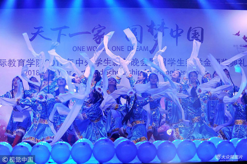 青島中學生在中外學生聯歡會暨留學生獎學金頒獎典禮上表演舞蹈《香格里拉之夢》。