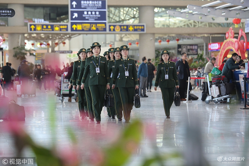 2018年3月5日,青島,在青島國際機場,女子旅檢科民警列隊赴出境大廳執行勤務。