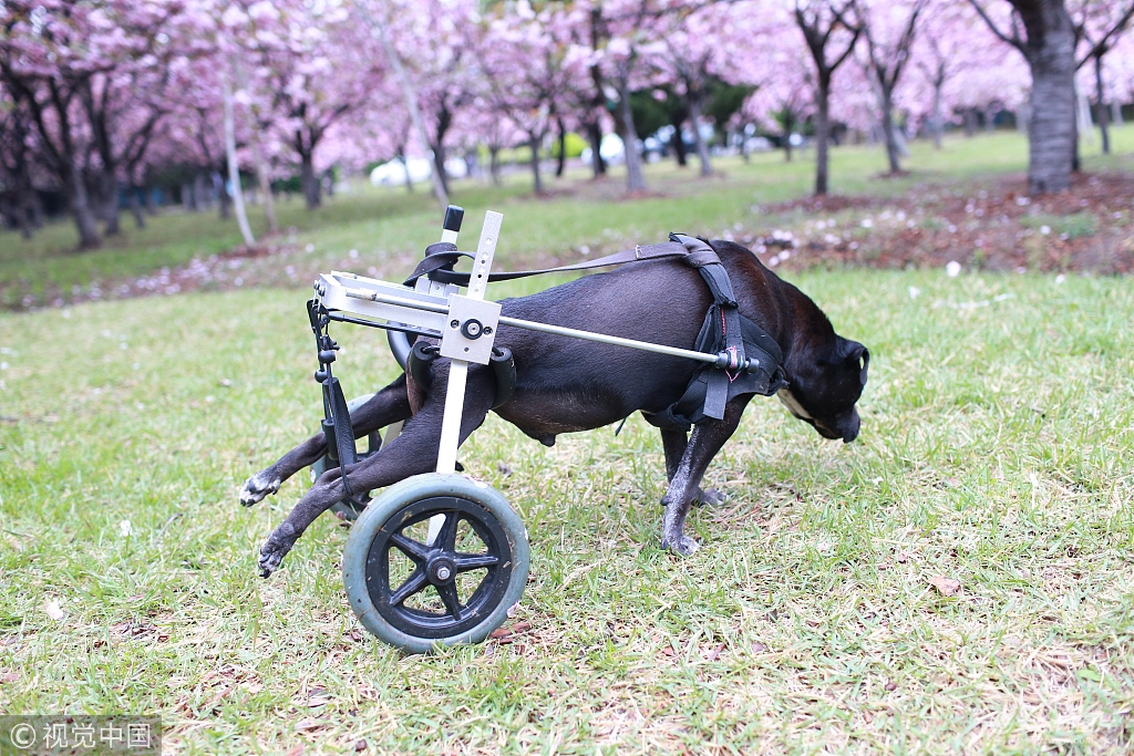 2018年4月22日,山東日照,在凱德廣場對面的櫻花園里,有這樣一只小狗引起游客的關注。據狗狗主人介紹,小狗的兩支后腿都已受傷無法行走,主人就想起給受傷的狗狗做了帶有輪子的支架,也能讓狗狗一定程度上可以行走,堪比“刀鋒戰士”。