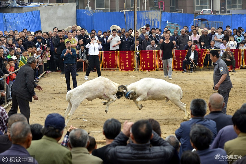 2018年5月1日,在山東省聊城市陽谷縣僑潤街道城角徐村 紅星廣場“紅星杯”第九屆魯西地區抵羊大賽活動現場,村民在參加抵羊大賽。